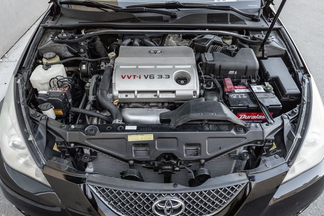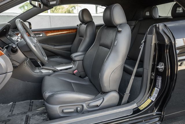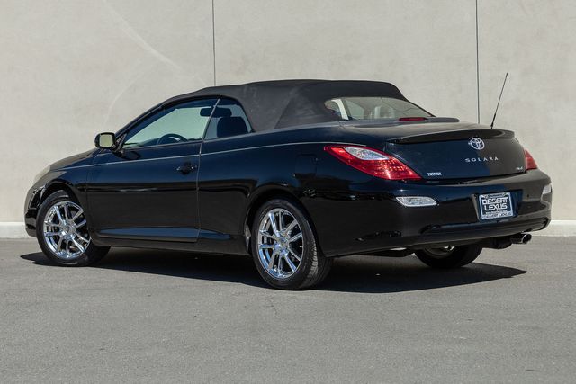 Clean CARFAX. Custom Chrome Wheels, Camry Solara SLE, 2D Convertible, 3.3L V6 SMPI DOHC, 5-Speed Automatic with Overdrive, FWD, Black, Dark Charcoal w/Leather Seat Trim, 4-Wheel Disc Brakes, 7 Speakers, ABS brakes, Air Conditioning, Alloy wheels, AM/FM radio, Auto-dimming door mirrors, Auto-dimming Rear-View mirror, Automatic temperature control, Bumpers: body-color, Carpet Floor/Trunk Mat Set (5 Piece Set), CD player, Compass, Convertible roof lining, Delay-off headlights, Driver door bin, Driver vanity mirror, Dual front impact airbags, Dual front side impact airbags, Four wheel independent suspension, Front anti-roll bar, Front Bucket Seats, Front Center Armrest w/Storage, Front fog lights, Front reading lights, Fully automatic headlights, Garage door transmitter: Homelink, Glass rear window, Heated door mirrors, Heated Front Bucket Seats, High-Intensity Discharge Headlamps, Illuminated entry, JBL Premium AM/FM w/In-Dash 6CD Changer, Leather Seat Trim, Leather Shift Knob, Leather steering wheel, Low tire pressure warning, Occupant sensing airbag, Outside temperature display, Panic alarm, Passenger door bin, Passenger vanity mirror, Power convertible roof, Power door mirrors, Power driver seat, Power steering, Power windows, Radio data system, Rear anti-roll bar, Rear window defroster, Remote keyless entry, Security system, Speed control, Speed-sensing steering, Spoiler, Steering wheel mounted audio controls, Tachometer, Telescoping steering wheel, Tilt steering wheel, Traction Control, Trip computer, Variably intermittent wipers, Vehicle Stability Control. Black 2007 Toyota Camry Solara SLE 2D Convertible FWD 3.3L V6 SMPI DOHC 20/29 City/Highway MPG