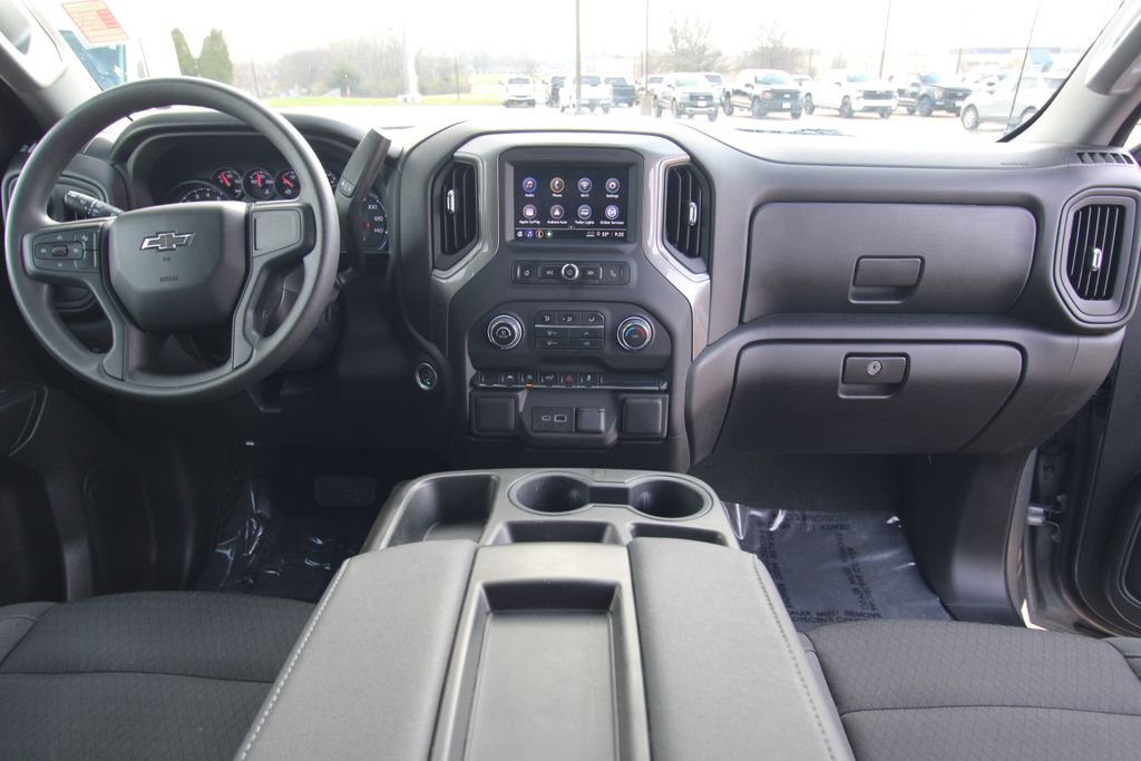 2023 Chevrolet Silverado 1500 Custom Sterling Gray Metallic 4D Crew Cab 2.7L Turbo 8-Speed Automatic 4WD Custom This vehicle comes well equipped with Custom Convenience Package (Electric Rear-Window Defogger, EZ Lift Power Lock & Release Tailgate, LED Cargo Area Lighting, Remote Vehicle Starter System, and Theft Deterrent System (Unauthorized Entry)), Custom Value Package, High Capacity Suspension Package, Preferred Equipment Group 1CX (10-Way Power Driver Seat w/Lumbar, 120-Volt Bed Mounted Power Outlet, 120-Volt Instrument Panel Power Outlet, 3.5" Monochromatic Display Driver Info Center, Bluetooth® For Phone, Chevrolet Connected Access Capable, Color-Keyed Carpeting Floor Covering, Compass, Deep-Tinted Glass, Dual Rear USB Ports (Charge Only), Electrical Steering Column Lock, Electronic Cruise Control, Front Frame-Mounted Black Recovery Hooks, Front Rubberized Vinyl Floor Mats, HD Rear Vision Camera, Manual Tilt Wheel Steering Column, OnStar & Chevrolet Connected Services Capable, Power Front Windows w/Driver Express Up/Down, Power Front Windows w/Passenger Express Down, Power Rear Windows w/Express Down, Rear 60/40 Folding Bench Seat (Folds Up), Rear Rubberized-Vinyl Floor Mats, Remote Keyless Entry, SiriusXM Radio, Standard Tailgate, Wi-Fi Hot Spot Capable, and Wireless Phone Projection), Rally Edition (4" Black Round Assist Steps (LPO), Black Chrome Exhaust Tip (LPO), Chevytec Spray-On Black Bedliner, and Wheels: 20" x 9" High Gloss Black Painted Alum), Trailering Package (Hitch Guidance), 3.42 Rear Axle Ratio, 4-Wheel Disc Brakes, 40/20/40 Front Split-Bench Seat, 6 Speakers, 6-Speaker Audio System, ABS brakes, Air Conditioning, All-Weather Floor Liner (LPO), Alloy wheels, AM/FM radio: SiriusXM, Apple CarPlay/Android Auto, Auto High-beam Headlights, Automatic Emergency Braking, Brake assist, Bumpers: body-color, Cloth Seat Trim, Delay-off headlights, Driver door bin, Driver vanity mirror, Dual front impact airbags, Dual front side impact airbags, Electronic Stability Control, Following Distance Indicator, Forward Collision Alert, Front anti-roll bar, Front Center Armrest w/Storage, Front Pedestrian Braking, Front reading lights, Front wheel independent suspension, Fully automatic headlights, Heated door mirrors, Illuminated entry, IntelliBeam Automatic High Beam On/Off, Lane Keep Assist w/Lane Departure Warning, Low tire pressure warning, Not Equipped w/Rear USB Ports, Not Equipped w/Steering Column Lock, Occupant sensing airbag, Outside temperature display, Overhead airbag, Overhead console, Panic alarm, Passenger door bin, Passenger vanity mirror, Power door mirrors, Power driver seat, Power steering, Power windows, Premium audio system: Chevrolet Infotainment 3, Radio data system, Radio: Chevrolet Infotainment 3 System, Rear reading lights, Rear step bumper, Rear window defroster, Remote keyless entry, Security system, Speed control, Speed-sensing steering, Split folding rear seat, Tachometer, Tilt steering wheel, Traction control, Trip computer, Variably intermittent wipers, Voltmeter, and Wheels: 20" x 9" Bright Silver Painted Aluminum.