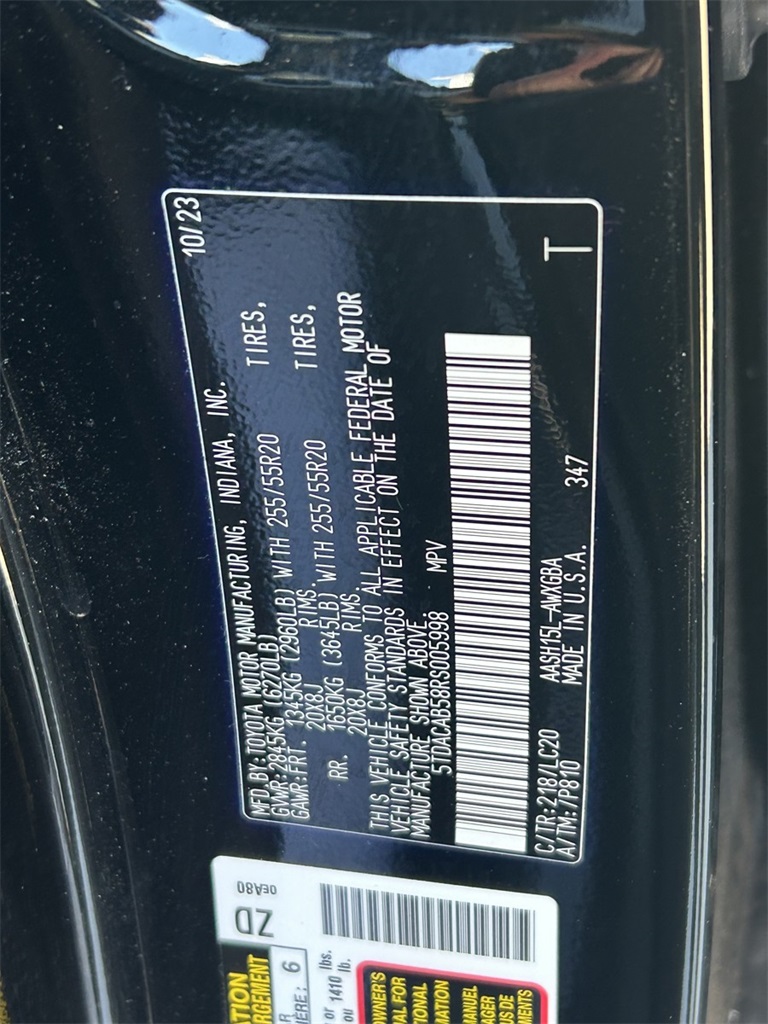 CARFAX One-Owner. 2.5L 4-Cylinder, 11 Speakers, 20" Aluminum Alloy Wheels, 2nd Row Bench Seat, 3rd row seats: split-bench, 4-Wheel Disc Brakes, ABS brakes, Air Conditioning, All Weather Floor Liners/Cargo Tray (TMS), Alloy wheels, AM/FM radio: SiriusXM, Apple CarPlay/Android Auto, Auto High-beam Headlights, Auto-dimming Rear-View mirror, Automatic temperature control, Black Emblem Overlays (TMS), Brake assist, Bumpers: body-color, Delay-off headlights, Driver door bin, Driver vanity mirror, Dual front impact airbags, Dual front side impact airbags, Electronic Stability Control, Emergency communication system: Safety Connect (up to 10-year trial subscription), Exterior Parking Camera Rear, Four wheel independent suspension, Front anti-roll bar, Front Bucket Seats, Front Center Armrest, Front dual zone A/C, Front fog lights, Front reading lights, Fully automatic headlights, Garage door transmitter: HomeLink, Heated & Ventilated Front Seats w/Memory, Heated door mirrors, Heated front seats, Heated rear seats, Heated steering wheel, Illuminated entry, Knee airbag, Leather Seat Trim, Leather Shift Knob, Leather steering wheel, Logo Side Puddle Lamp (TMS), Low tire pressure warning, Memory seat, Navigation system: Drive Connect Cloud Navigation (1-year trial subscription), Occupant sensing airbag, Outside temperature display, Overhead airbag, Overhead console, Panic alarm, Panoramic Roof, Panoramic View Monitor, Passenger door bin, Passenger vanity mirror, Power door mirrors, Power driver seat, Power Liftgate, Power passenger seat, Power steering, Power windows, Radio: 12.3" Toyota Audio Multimedia w/JBL Premium, Rain sensing wipers, Rear air conditioning, Rear anti-roll bar, Rear Hatch Cargo Lamps (TMS), Rear reading lights, Rear window defroster, Rear window wiper, Reclining 3rd row seat, Remote keyless entry, Security system, Speed control, Speed-sensing steering, Split folding rear seat, Spoiler, Steering wheel mounted audio controls, TBD Axle Ratio, Telescoping steering wheel, Tilt steering wheel, Traction control, Trip computer, Turn signal indicator mirrors, Variably intermittent wipers, Ventilated front seats.